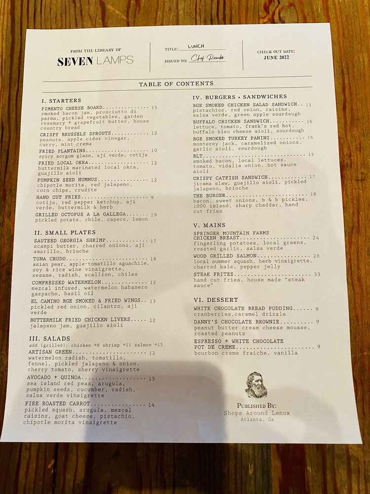 Seven Lamps, a New American and Seafood restaurant located in Atlanta, GA, offers a diverse menu with options for vegan and vegetarian diners. The restaurant provides a trendy and welcoming atmosphere with options for outdoor seating and private parking. Known for its excellent service and happy hour specials, Seven Lamps caters to various preferences with a full bar and catering services. The restaurant also accommodates families and pets, making it a versatile dining option. With a focus on sustainability, Seven Lamps provides reusable tableware and ensures a memorable dining experience for all guests. My experience dining at Seven Lamps was delightful, with flavorful dishes and attentive staff contributing to an overall enjoyable meal.
